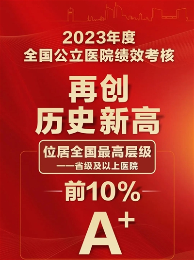 2025年3月,国家卫生健康委公布2023年度公立医院绩效考核结果,医院在省级及以上医院考核中获得 A+,实现“四连 A+”。在医疗质量、运营效能、持续发展、满意度评价四大维度26项核心监测指标中,医院稳居全国省级及以上层级医院前10%,其中DRG组数 (病种)位列全省第三,CMI 值(病例难度系数)居全省第四。